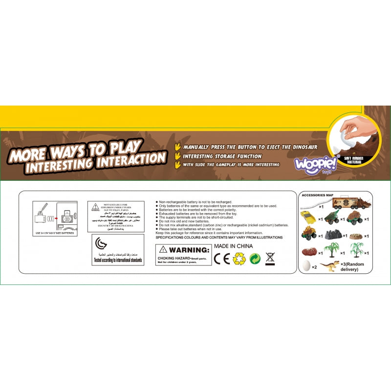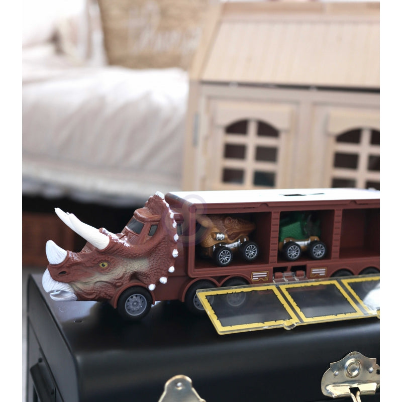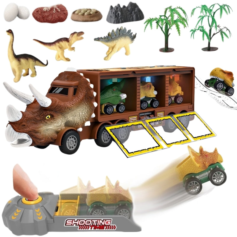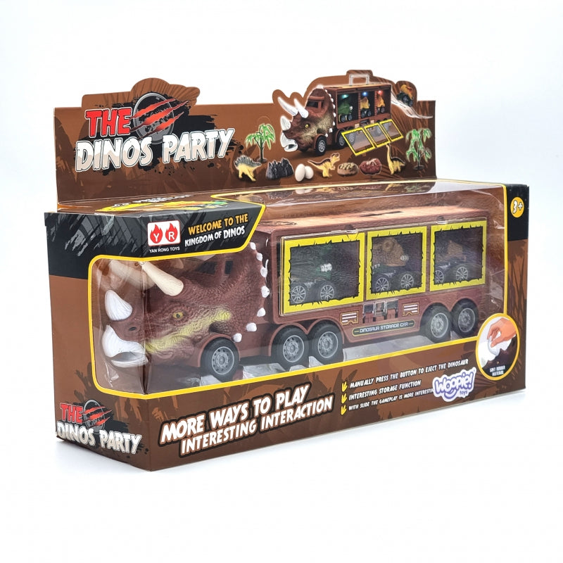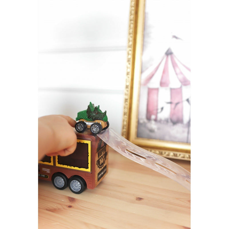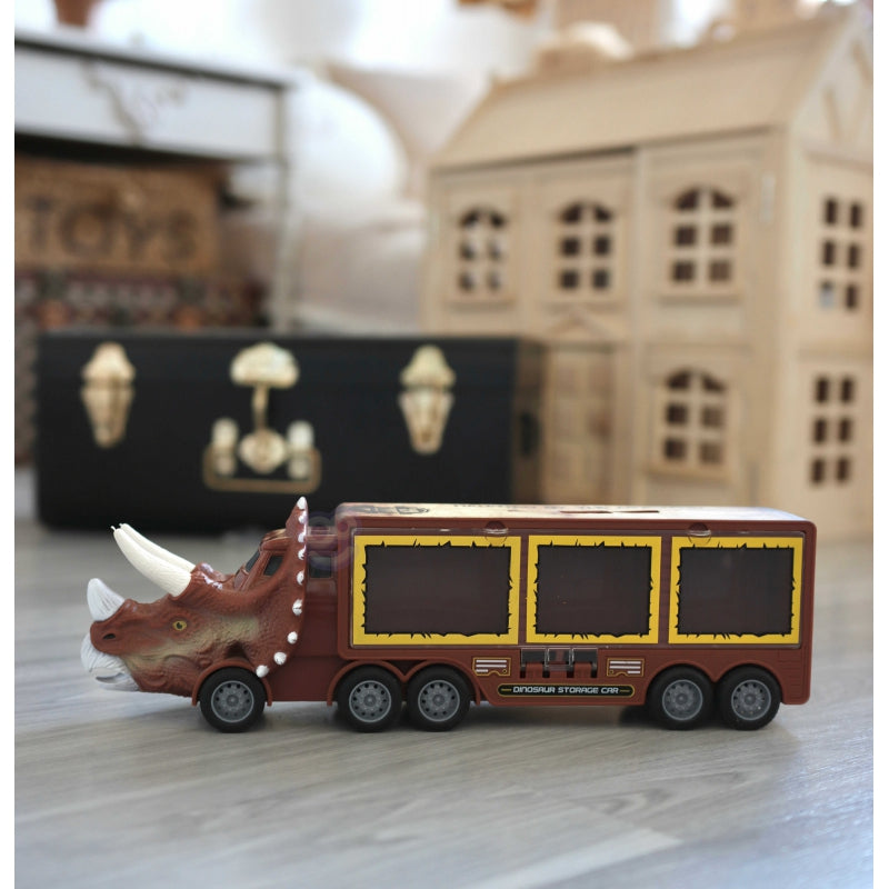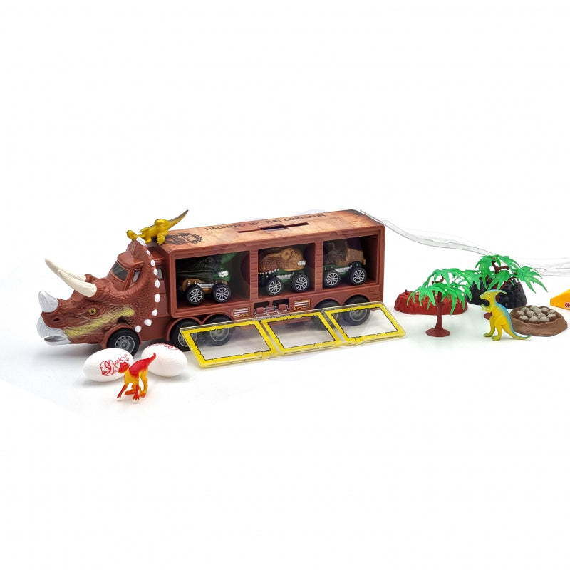 Dinozauro formos sunkvežimis puikus žaislas, nes žaisdamas vaikas gilinasi į dinozaurų eros pasaulį. Labai realistiškai pagamintos transporto priemonės, kur dėmesys skiriamas kiekvienai detalei. Didelio sunkvežimio viduje yra 3 mažesnės dinozaurų transporto priemonės. Prie viso rinkinio pridedamas paleidimo įtaisas, kuriuo galima dar labiau paįvairinti pramogas.