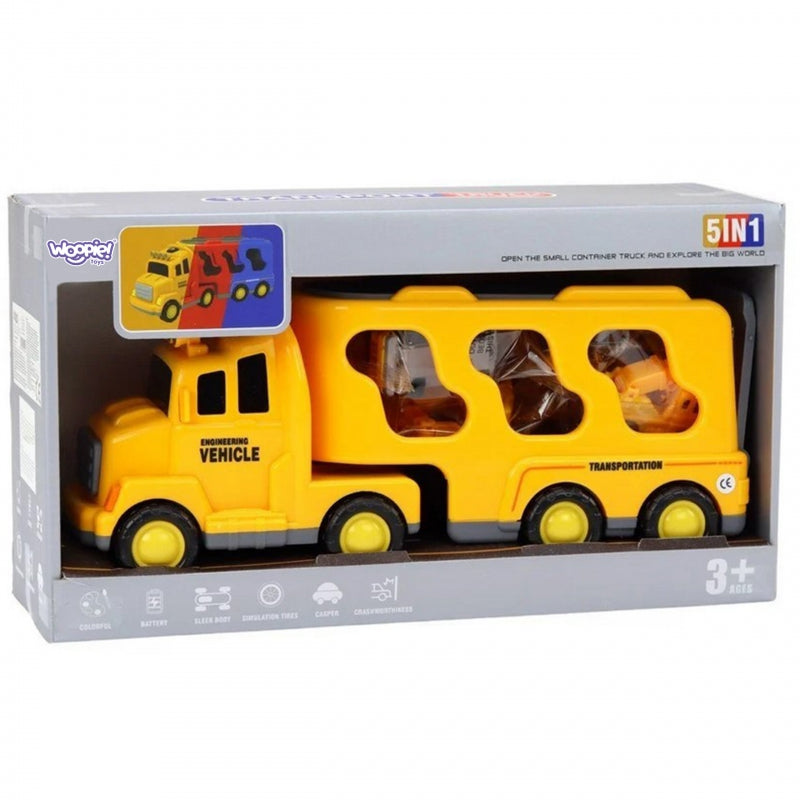 WOOPIE "Roadside Assistance" automobilių rinkinys - tai žaislas, kuris pradžiugins mažuosius automobilių ir konstrukcinių transporto priemonių mėgėjus. Jis suteiks valandų valandas užburiančio žaidimo, kuris skatins jūsų vaiko vaizduotę. Rinkinį sudaro 5 automobiliai: didelė priekaba, kurią po žaidimo galima naudoti kaip mažesnių automobilių saugyklą, ekskavatorius, betono maišyklė, kranas, buldozeris.