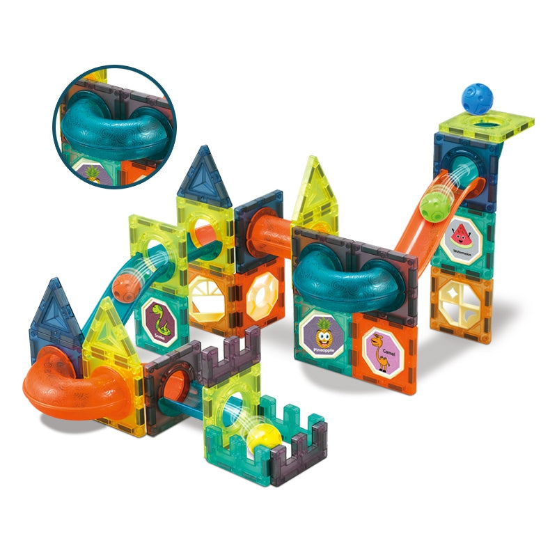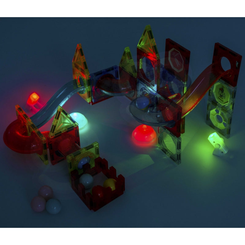 Šviečianti magnetinė trasa pritrauks dėmesį ir sužavės vaiką. Blokelius labai lengva sujungti tarpusavyje ir iš jų galima kurti nuostabias konstrukcijas su kalneliais, kuriomis juda kamuoliukas. Kad trasa būtų dar įspūdingesnė, ją galima apšviesti komplekte esančiu žibintuvėliu, o jūsų vaikas galės stebėti, kaip juda šviesa, ir taip lavinti savo suvokimą. Konstruodami trasą taip, kad kamuoliukai be problemų pasiektų jos galą, lavinsite vaiko loginį mąstymą, vaizduotę, kūrybiškumą ir koncentraciją. Dėliodamas blokeliusvaikas susipažįsta su formomis ir spalvomis, lavina rankų įgūdžius ir smulkiąją motoriką.