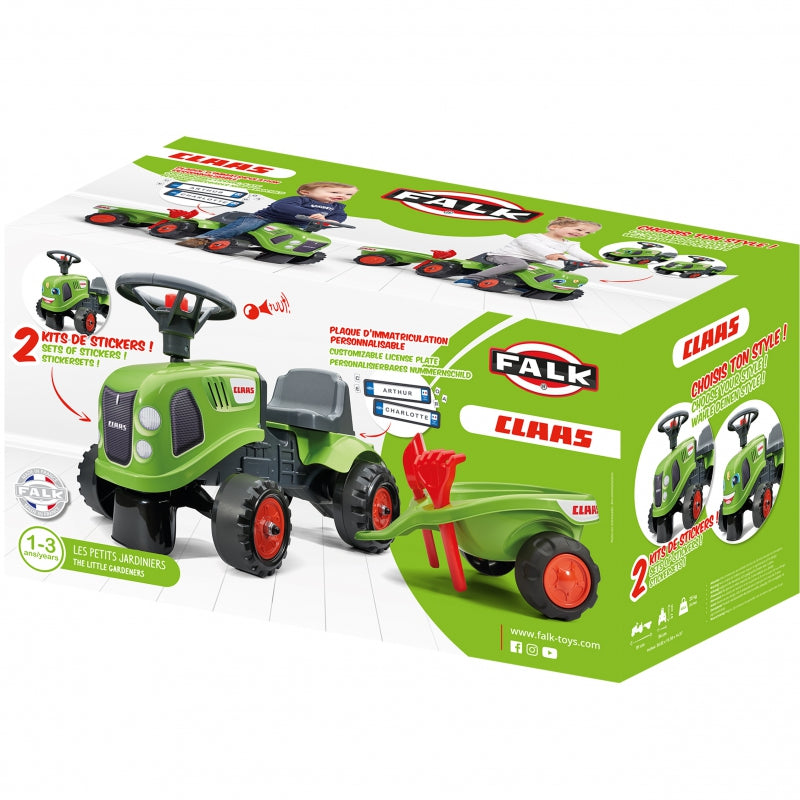„Baby Claas“ traktorius su „Falk“ priekaba – daugelio mažųjų traktorininkų svajonių išsipildymas. Pagaminta kruopščiai, atkreipiant dėmesį į smulkiausias detales! Transporto priemonėje sumontuota nuimama priekaba su skydais ir vairas su garso signalu. Traktoriaus ratai pagaminti iš aukštos kokybės plastiko. Be traktoriaus, turime grėblį ir kastuvą, kad galėtų žaisti mūsų vaikai.