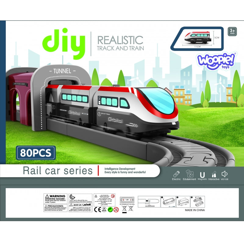 Traukinių trasa su tuneliu ir transporto priemonėmis - 80 detalių Woopie