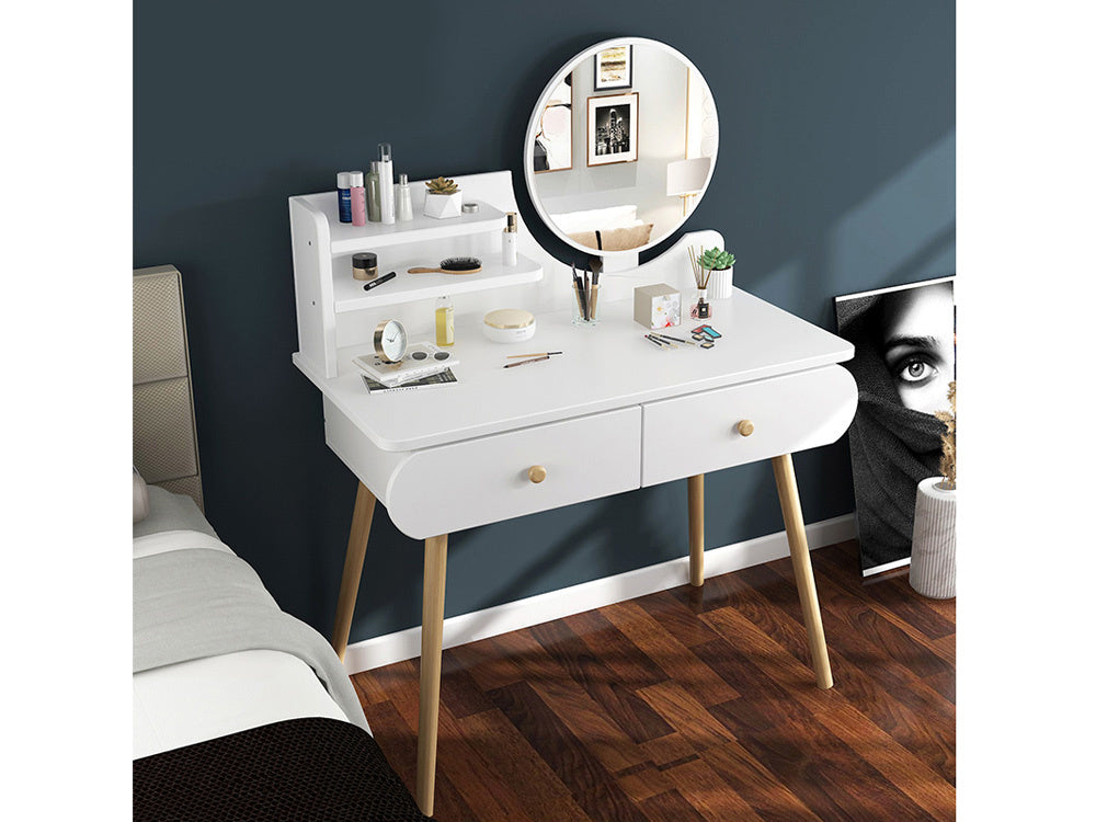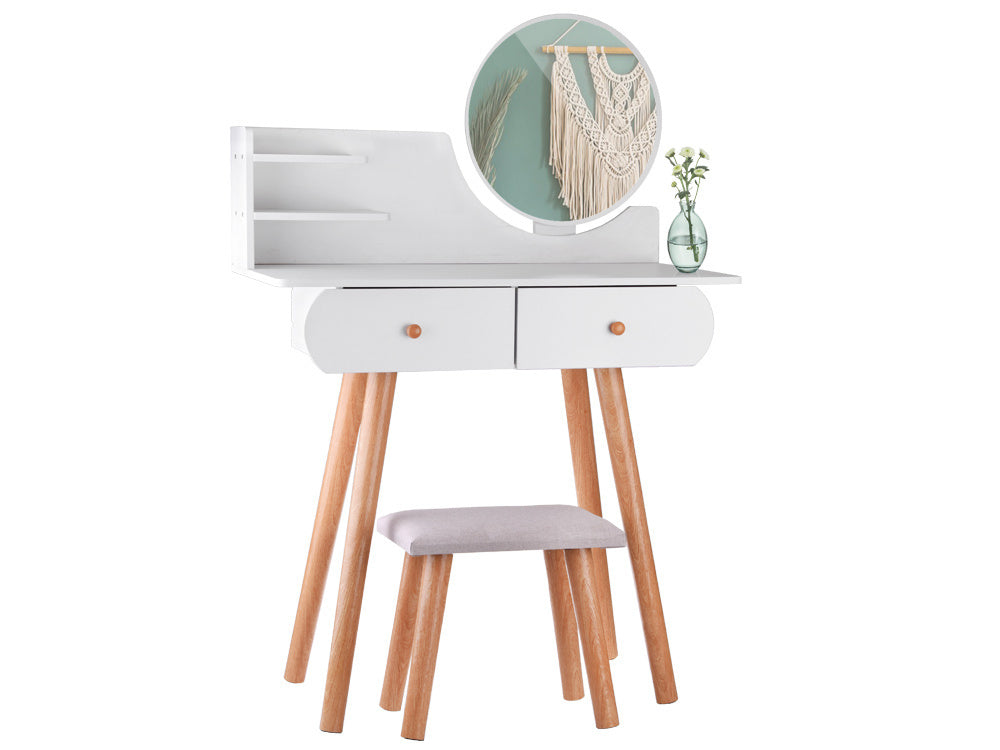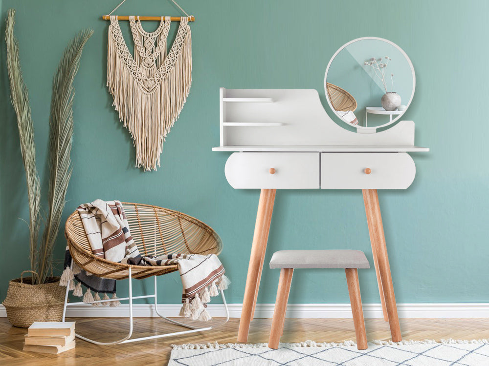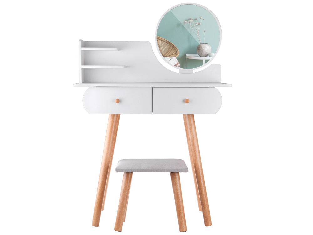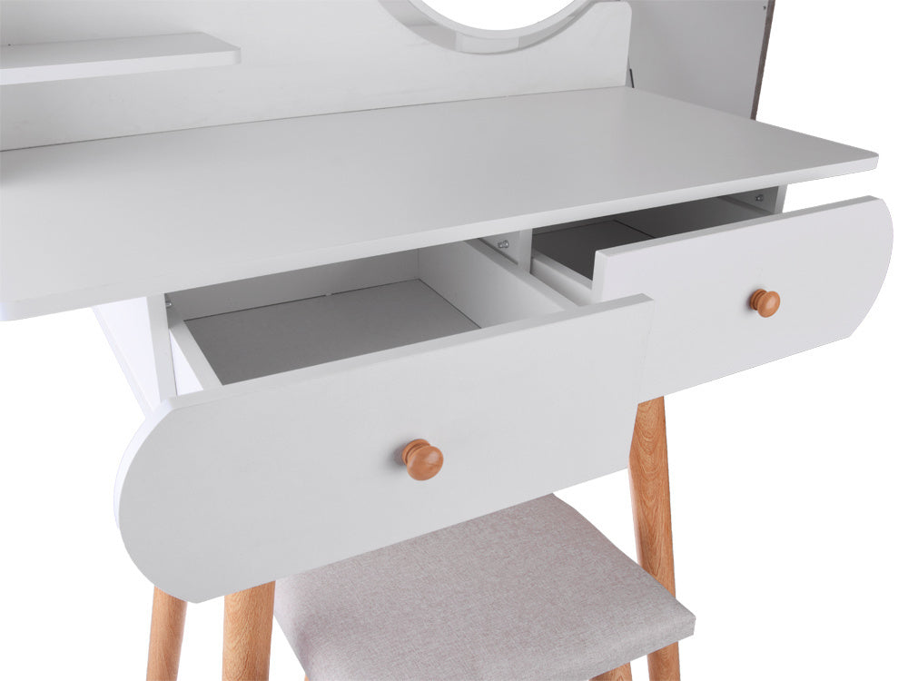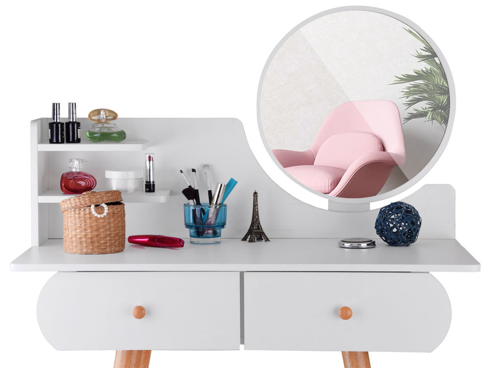 Funkcionalus, minimalistinis skandinaviško stiliaus tualetinis staliukas gali tapti puikiu mergaitės kambario aksesuaru. Baltas tualetinis staliukas su apvaliu veidrodžiu, talpiais stalčiais ir patogia taburete puikiai tinka makiažui pasidaryti, šukuosenai šukuoti, aprangai modeliuoti ir net dienoraščiui rašyti.