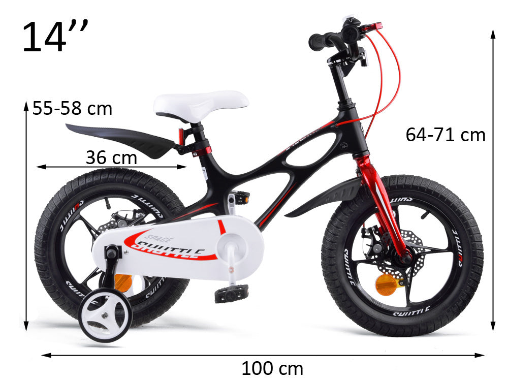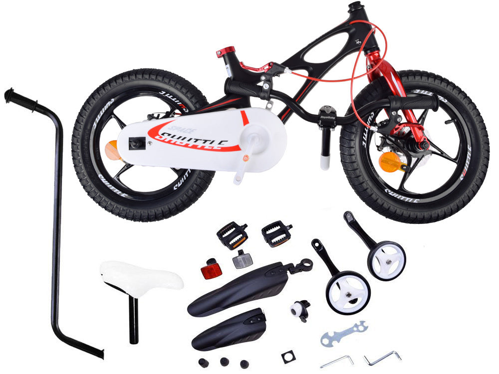 Garsios kompanijos Royal Baby dviratis Space Shuttle 14 "yra pirmasis aukštos kokybės dviratis dviračių mėgėjams, jis idealiai tinka tikram kiemo vairuotojui. Lengvas magnio rėmas su išlenktu paviršiumi ir sklandžiomis linijomis. Reguliuojamas profesionaliai profiliuotas vairas su saugiomis guminėmis rankenėlėmis, uždaru dangčiu, skambučiu ir atšvaitu. Šis dviratis yra puikiai poliruotas, atstumas tarp vairo, sėdynės ir pedalo yra proporcingai išlaikytas, o tai užtikrina sklandų ir patogų važiavimą.