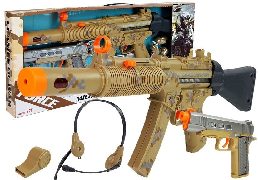Rinkinį jaunam kareiviui sudaro du pistoletai, ausinių rinkinys su mikrofonu, skirtu vienas su kitu susisiekti. Du jauni kariai gali pradėti linksmybes! Nė vienas piktadarys nepabėgs!