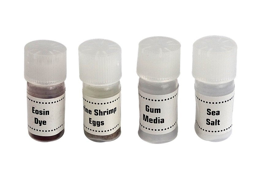 - 4 mėgintuvėliai su preparatais: jūros druska, guma gyvybei