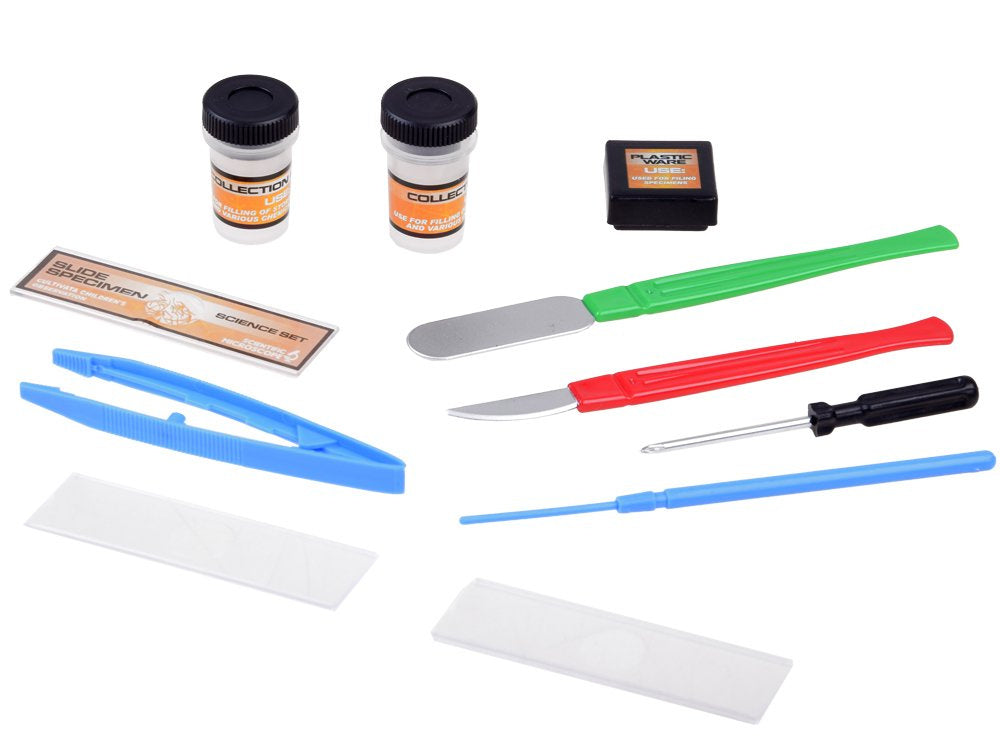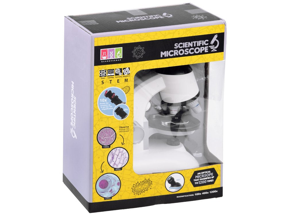 Puikus ir kruopščiai pagamintas vaikiškas mikroskopas su priedais. Mikroskopas turi besisukantį 360° okuliarą, trijų tipų didinimą 4x / 10x / 40x ir įmontuotą lemputę apšviesti tiriamus mėginius.