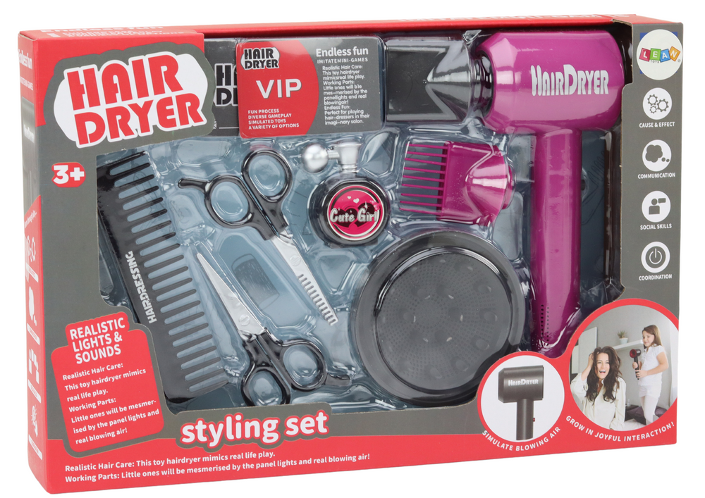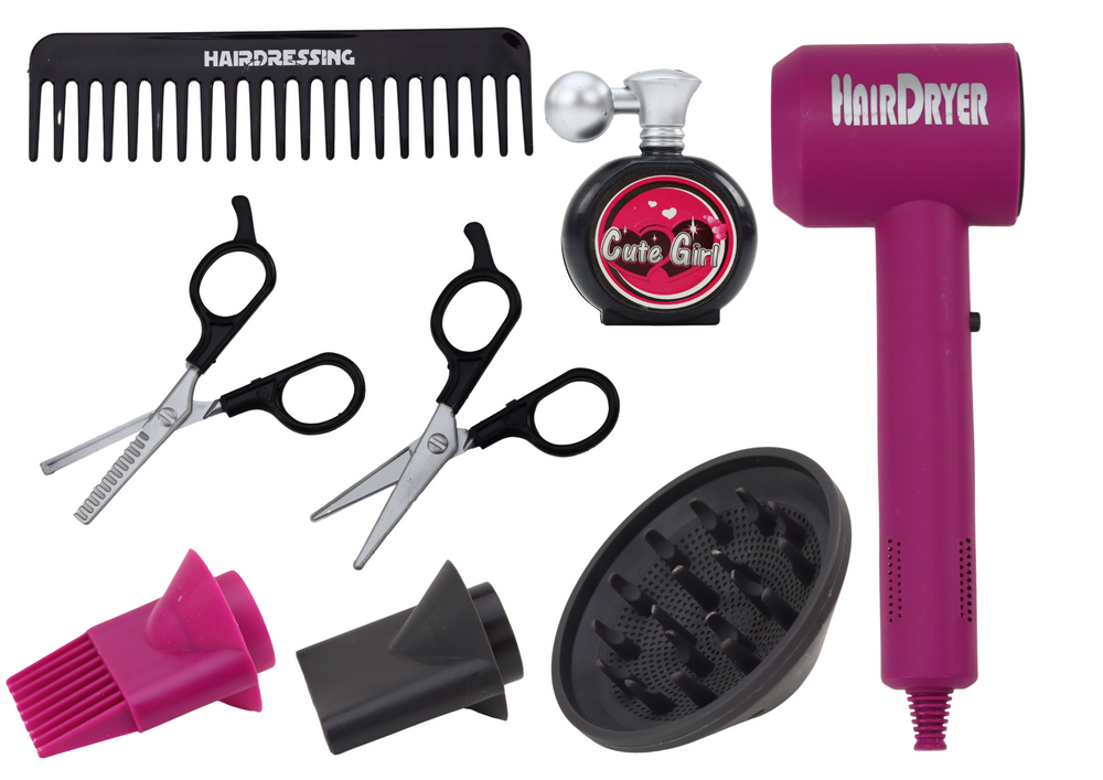 Vaikų kirpyklos rinkinys - puikus žaislas mažiesiems kirpėjams, norintiems pasijusti tikrais kirpėjais. Rinkinį sudaro 10 dalių, kurios suteikia daugybę galimybių žaisti ir kurti. Pagrindinis rinkinio elementas - rožinės spalvos plaukų džiovintuvas, kuris žaislui suteikia žavesio ir patrauklumo. Vaikų kirpyklos rinkinys yra ne tik žaislas, bet ir priemonė vaizduotei ir kūrybiškumui ugdyti, rankų įgūdžiams lavinti ir įsitraukti į vaidmeninius žaidimus.