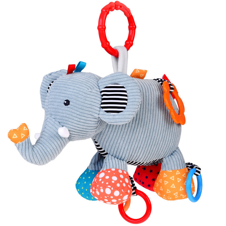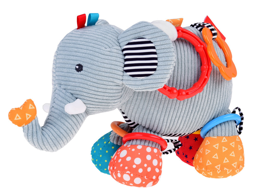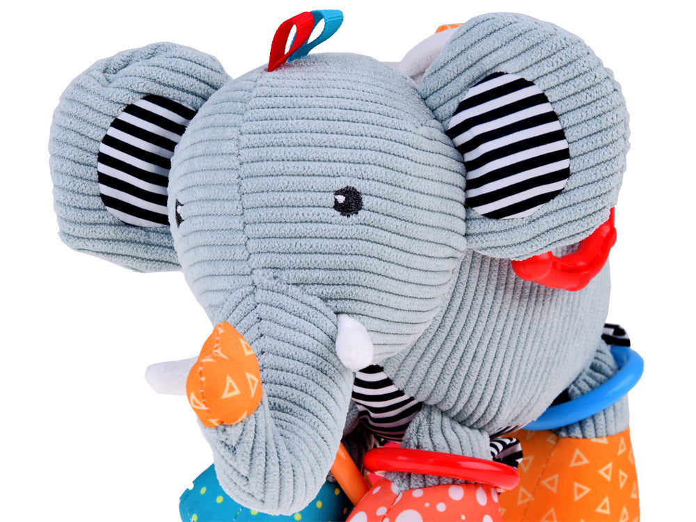 Žavingo drambliuko formos vežimėlio pakabukas - puikus jūsų mažylio pasivaikščiojimų palydovas! Keturios spalvingos jo kojytės yra su plastikiniais ratukais, kurie judėdami švelniai stuksena į pliušines kojas, skleisdami subtilius garsus, kad atkreiptų vaiko dėmesį. Pliušinio drambliuko viduje yra kamuoliukas, kurį pakračius skamba skambutis, suteikiantis papildomą pramogą ir sensorinę stimuliaciją. Drambliukas ne tik žavus, bet ir labai minkštas bei malonus priglausti, todėl jis yra puikus palydovas tiek pasivaikščiojimuose, tiek namuose.