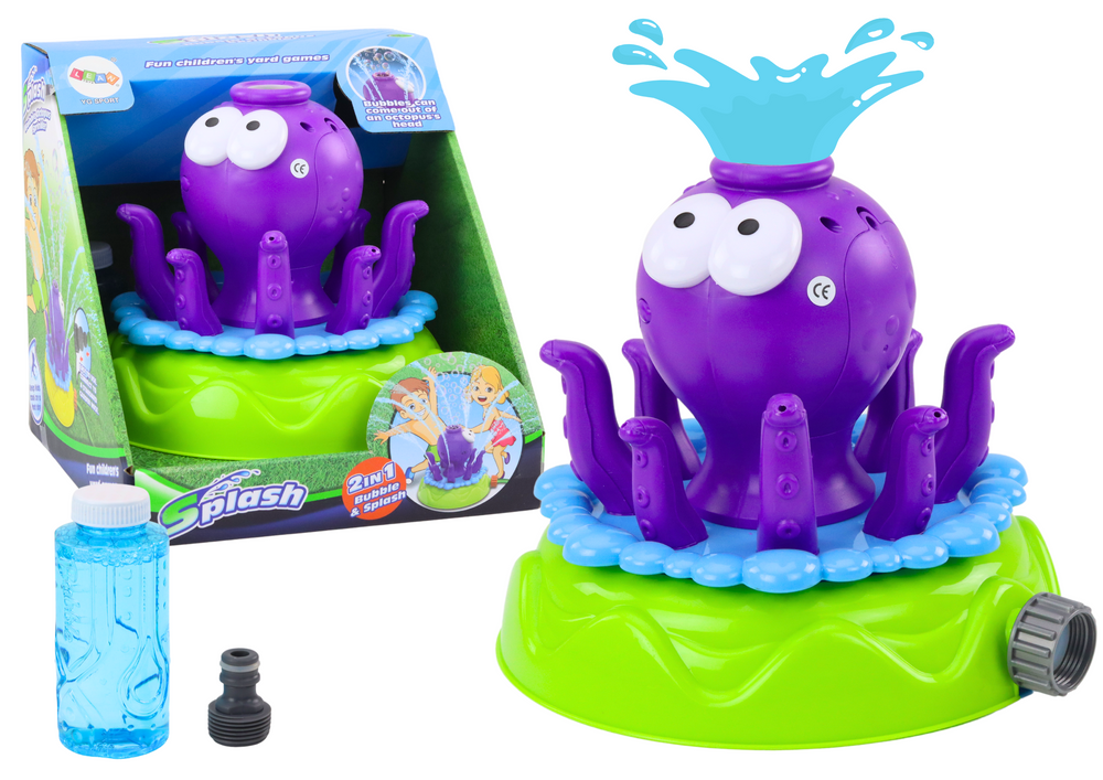 Aštuonkojo formos fontanas yra nepakeičiama atrakcija vaikams karštomis dienomis. Jo unikalus dizainas ir funkcionalumas įprastą popietę sode paverčia smagia, džiaugsmo ir juoko kupina veikla. Papildoma atrakcija - muilo burbulų ištraukimo funkcija. Aštuonkojis ne tik purškia vandenį, bet ir sukuria stebuklingus burbulus, kurie plūduriuoja ore, suteikdami žaidimui dar daugiau magijos ir smagumo. Į komplektą įeina burbulų skystis, todėl jį galima naudoti iš karto po įsigijimo.