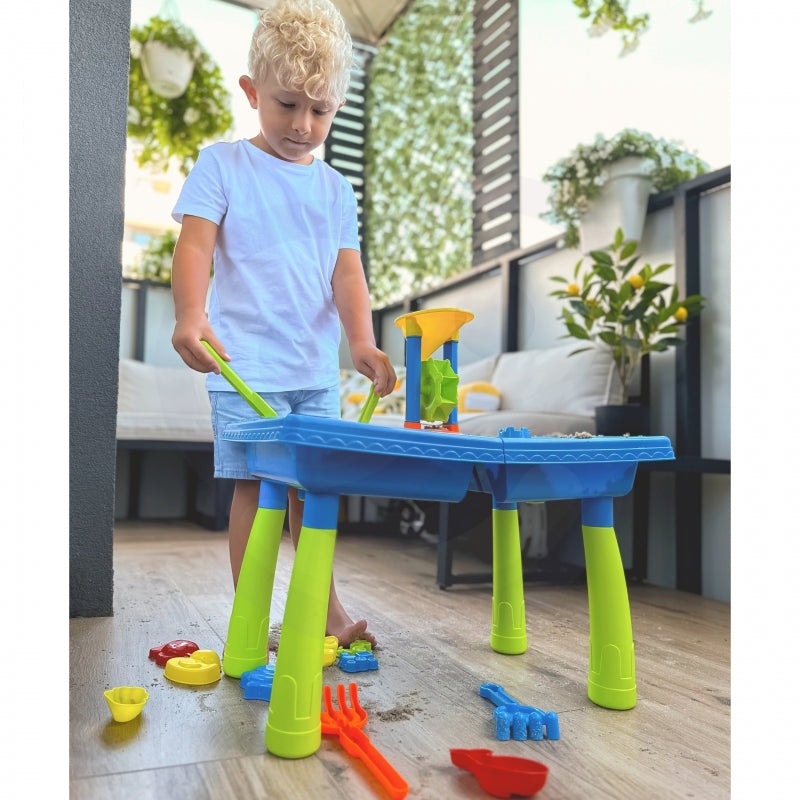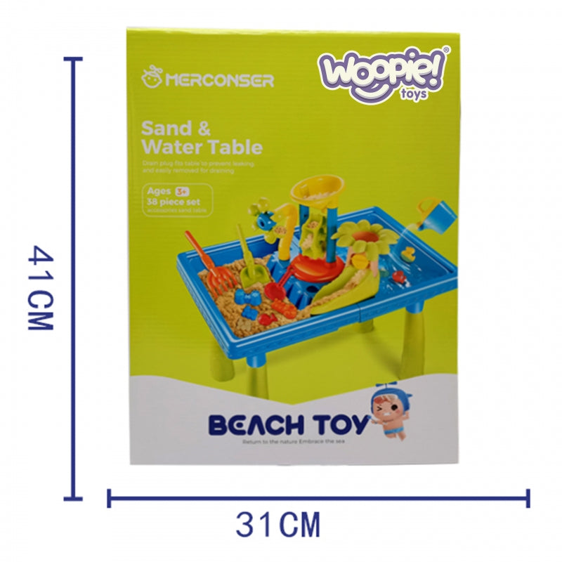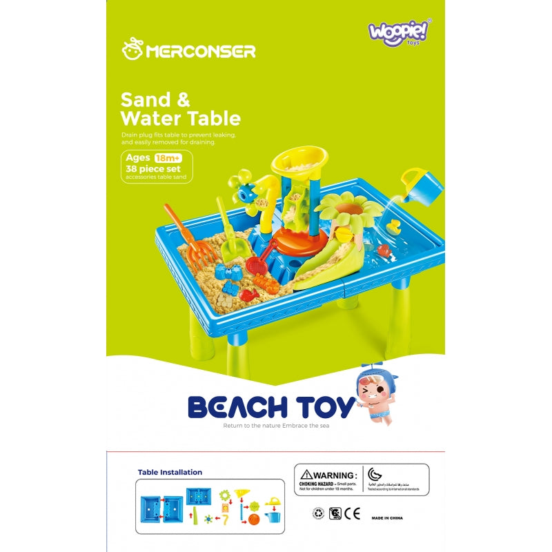 WOOPIE prekės ženklo "Water Table 2in1 Sandbox" yra puikus žaislas žaidimams su vandeniu ir smėliu. Stalas turi 2 įdubas, kurių viena pripildoma vandens, o kita - smėlio, todėl žaisti galima bet kur. Vaikas gali pilti vandenį į malūnėlį ir stebėti, kaip vanduo išjudina vandens malūną. Rinkinys idealiai tinka žaisti patalpose, paplūdimyje ar smėlio dėžėje.