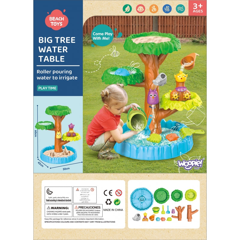 Prekės ženklo WOOPIE 4 dalių medžio formos vandens stalas yra puikiai tinka žaidimams su vandeniu ir smėliu. Rinkinyje yra viskas, ko reikia nesibaigiančioms linksmybėms.