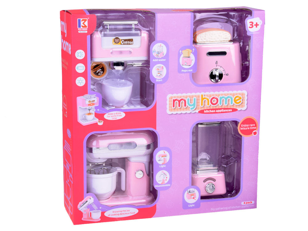 Fantastiškas mažų buitinių prietaisų rinkinys pravers bet kurioje žaislinėje virtuvėje. Dėl papildomos įrangos žaisti bus dar įdomiau ir tikroviškiau. Atskiros sudedamosios dalys pagamintos iš aukštos kokybės plastiko, daug dėmesio skiriant detalėms, todėl puikiai imituoja tikrus prietaisus. Šviesiai rožinė spalva su baltais ir chromuotais elementais atrodo tvarkingai ir elegantiškai. Be to, prietaisuose įrengtos garso ir šviesos funkcijos, kad jie būtų patrauklesni vaikui.