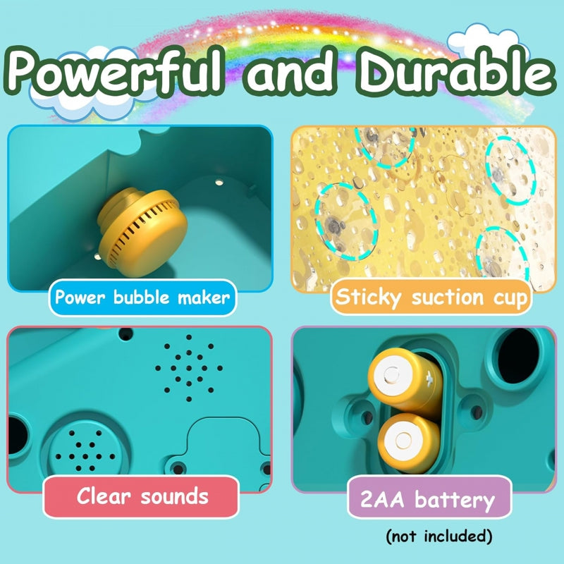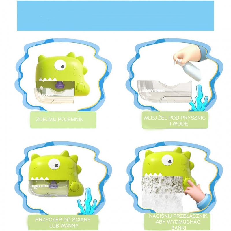 WOOPIE dinozauro formos vonios muilo burbulų gaminimo aparatas yra puikus žaislas, kurio talpa 250 ml, o įmontuotas galingas variklis gali automatiškai sukurti daugiau kaip 5 000 burbulų, todėl greitai užpildysite visą vonią. Patobulinti siurbtukai lengvai prisitvirtina prie lygių paviršių, itin lipnūs, todėl lengvai nenukrenta. Dinamiška muzika ir burbuliukai įkvepia vaikus žaisti maudantis, o mašinėlę galima bet kada išjungti.