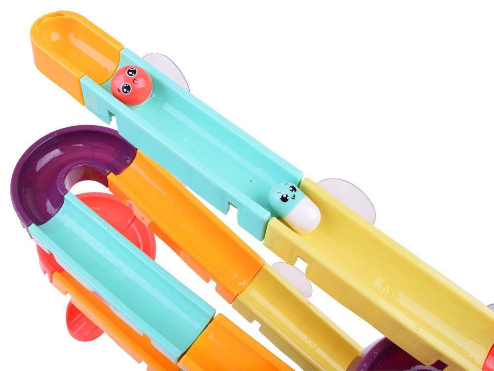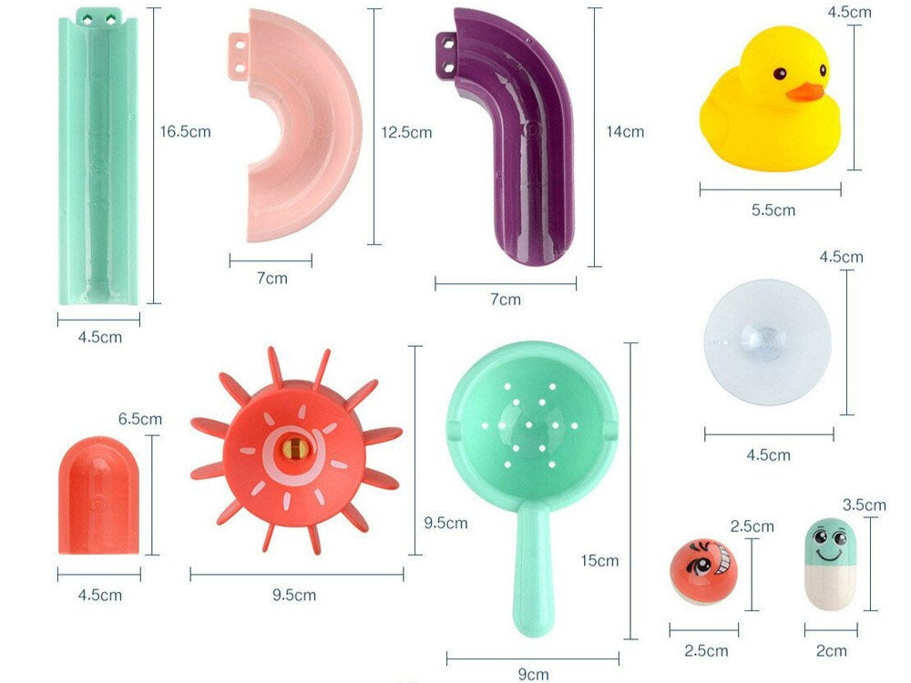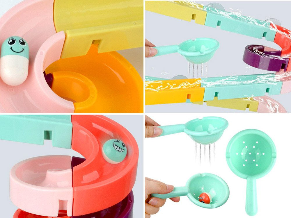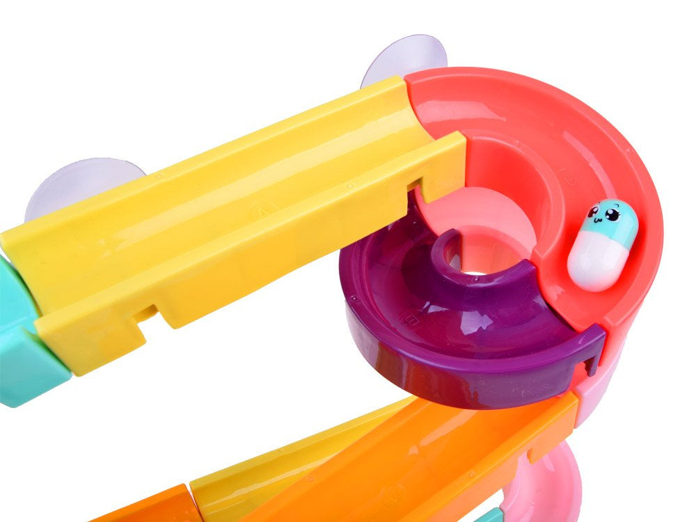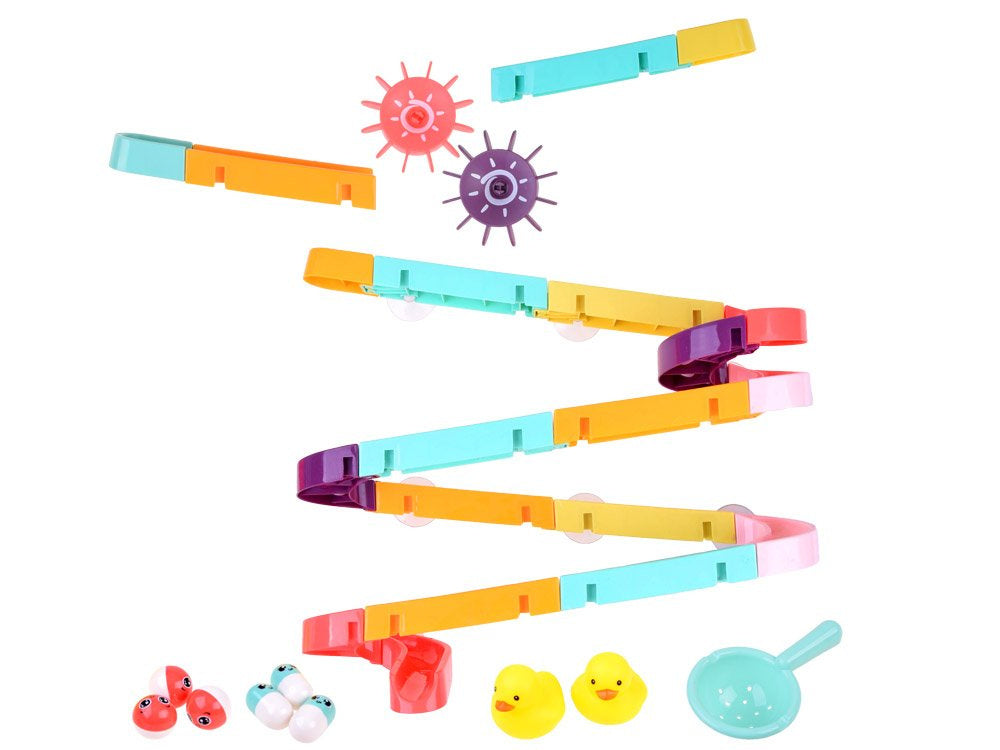 Kūrybiškas takelių rinkinys su žaisliniu kalneliu, skirtas smagiai praleisti laiką vonioje. Rinkinyje yra spalvingų detalių, iš kurių galima sukonstruoti susuktą takelį, guminių ančiukų, kamuoliukų, pupelių ir sietelio. Rinkinys yra labai estetiškas, gražių spalvų ir suteiks jūsų vaikui daug smagių, pozityvių žaidimų.
