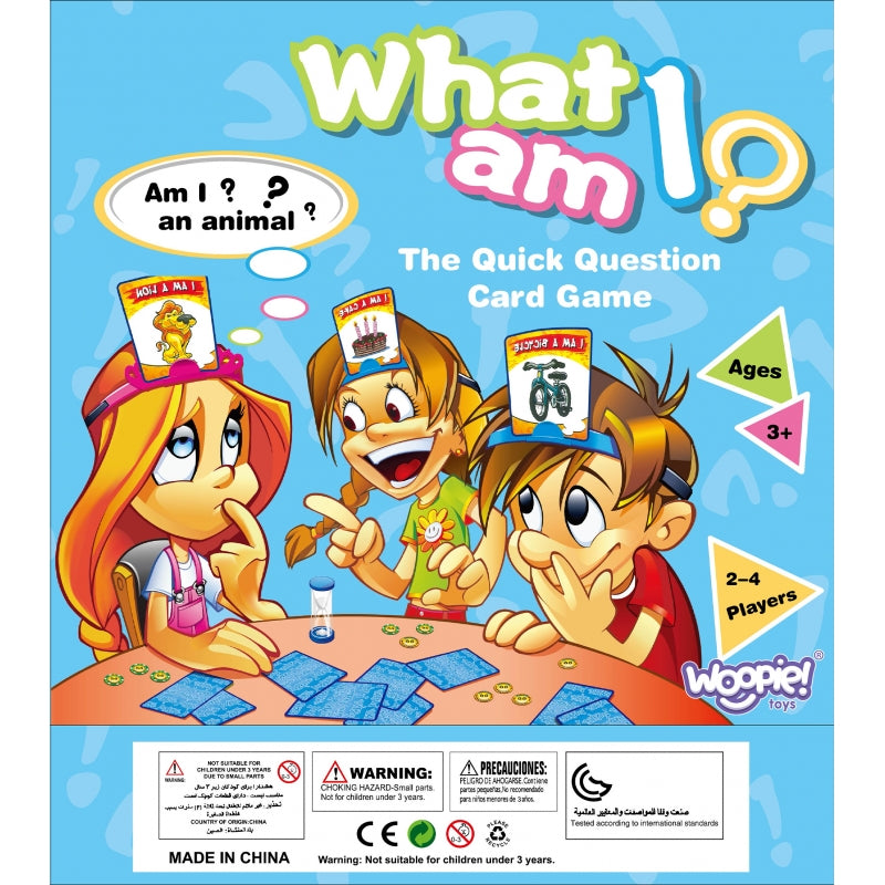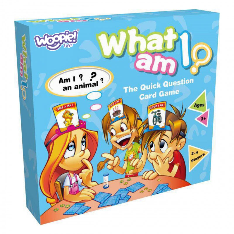 „Woopie“ prekės ženklo žaidimas „Kas aš esu?“ - tai pramoga ilgoms valandoms. Tai paprastas žaidimas, kuriame gali dalyvauti nuo 2 iki 4 žaidėjų. Kiekvienas žaidėjas ištraukia 1 kortelę ir uždeda ją ant šalia esančio asmens galvos. Užduokite klausimus kitiems dalyviams, į kuriuos išgirsite teigiamus arba neigiamus atsakymus, ir atspėkite, kas esate, kol nesibaigė smėlio laikrodžio smėlio matuojamas laikas. Laimi tas, kuris atspėja ir atiduoda daugiausia žetonų. Žaidimas padeda plėsti žodyną ir lavina priežasties ir pasekmės mąstymo įgūdžius. Puiki pramoga vakarėliuose, o estetiška pakuotė puikiai tinka dovanoms.