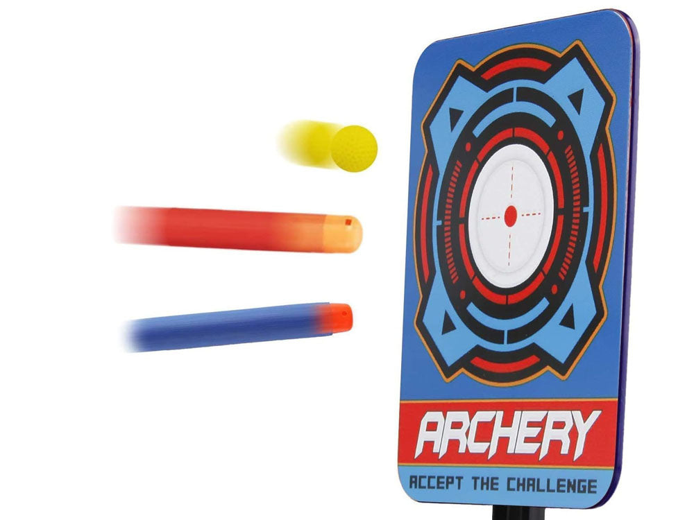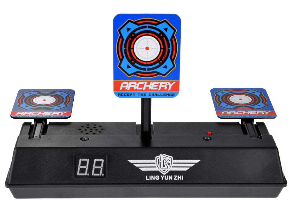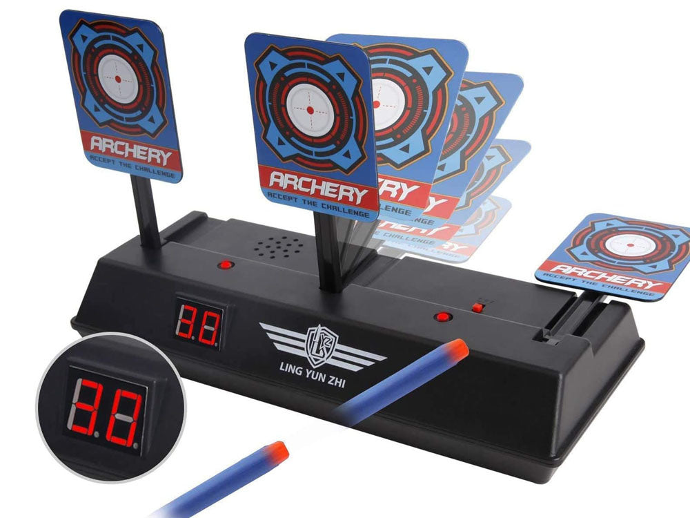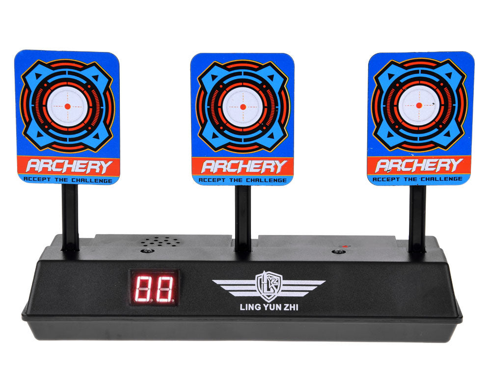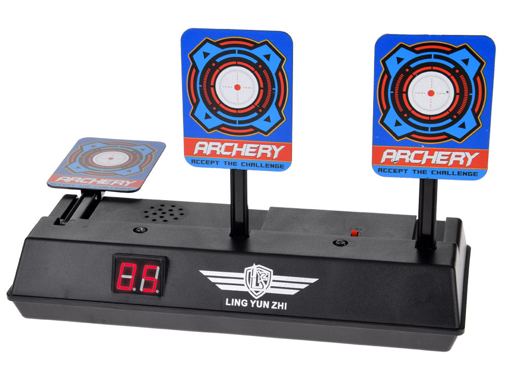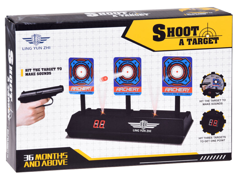 Interaktyvi automatinė 3 taikinių šaudykla, skirta šaudyti pistoletu su putplasčio šoviniais. Puiki idėja žaisti ir mokytis šaudyti į taikinį. Žaislas pagamintas tik iš plastiko su garso ir šviesos efektais.