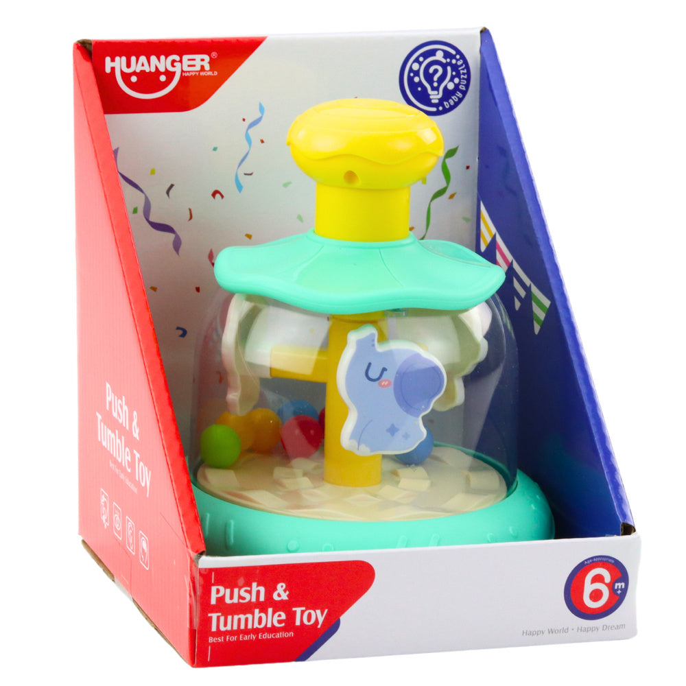 Besisukanti karuselė su kamuoliukais yra smagus ir lavinantis žaislas vaikams nuo 6 mėnesių. Žalios spalvos modelyje yra besisukančios figūrėlės: begemotas, liūtas ir beždžionė, papildytos spalvotais kamuoliukais, kurie žaisdami juda permatomo kupolo viduje. Paspaudus viršuje esantį geltoną mygtuką, suktukas įsijungia ir gyvūnai pradeda suktis aplink savo ašį, sukurdami dinamišką, spalvingą karuselę.