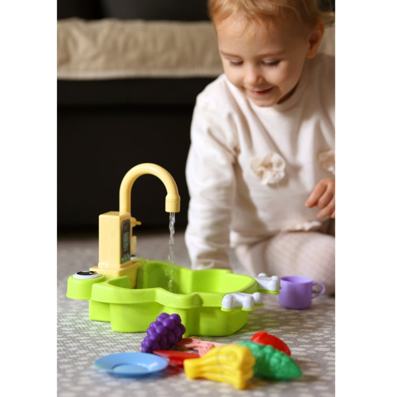 Su WOOPIE prekės ženklo kriaukle „Varlė“ vaikai galės plauti indus taip, kaip suaugusieji! Žaislas yra varlės formos, todėl dar lengviau paskatinsite vaiką žaisti ir jaustis taip, tarsi jis atliktų tikrus virtuvės darbus. Jis turi judančių dalių, pavyzdžiui, čiaupą, iš kurio teka tikras vanduo. Tai uždara grandinė - kad vanduo tekėtų iš čiaupo, pirmiausia jį reikia įpilti į kriauklę. Naudodamasis tokiu rinkiniu vaikas gali pats nuplauti vaisius ir plauti indus.
