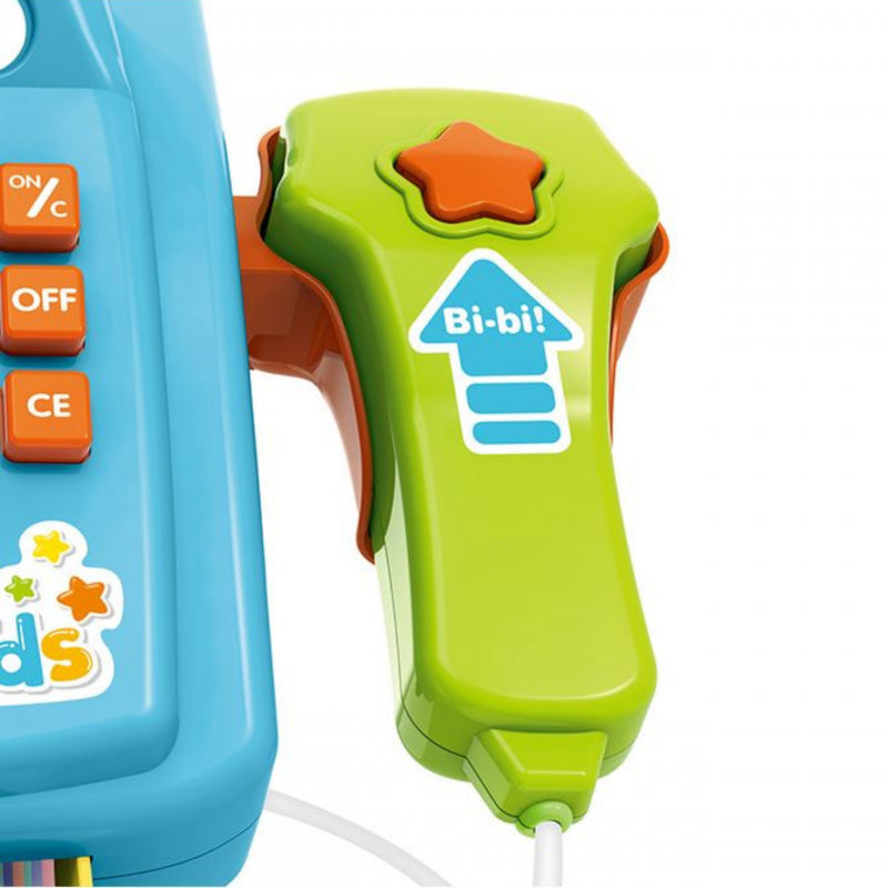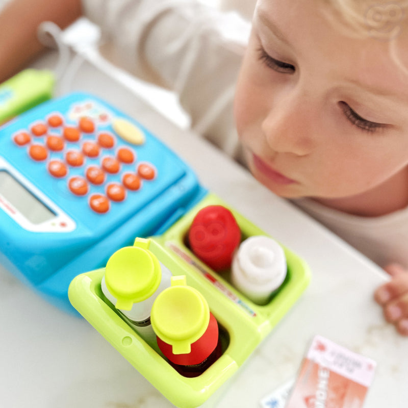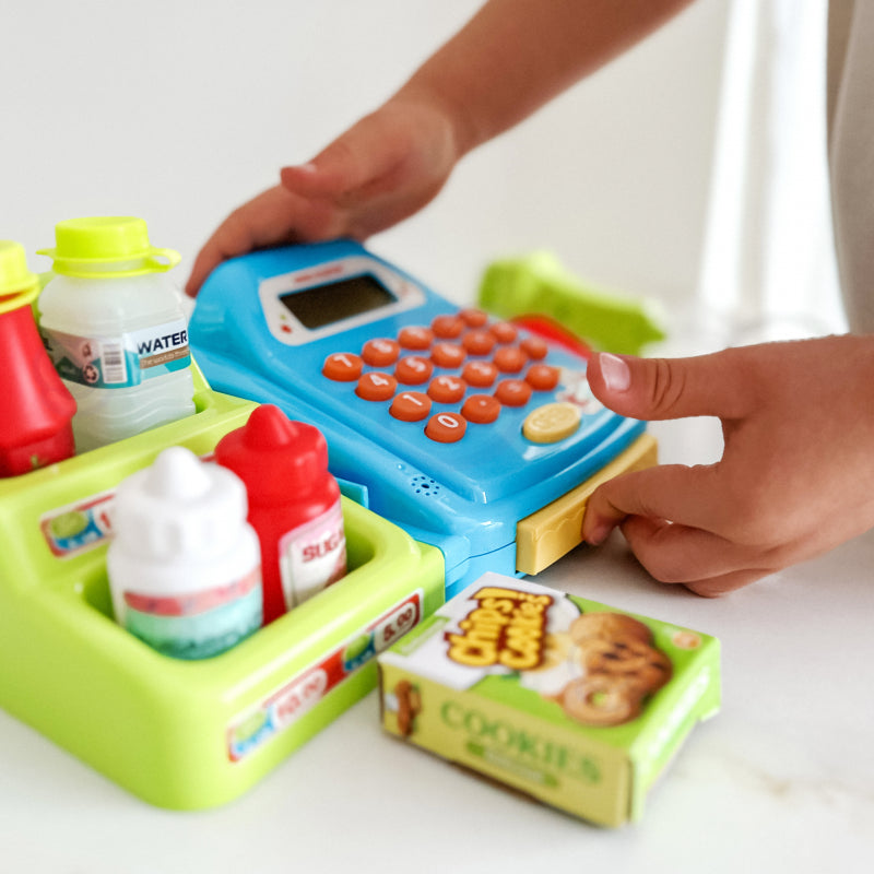 WOOPIE prekės ženklo parduotuvės kasos aparatas su lentyna idealiai tinka žaidimams. Vaikai gali pasirinkti produktus, kuriuos nori pirkti, o tada juos sukrauti ir naudodami skaitytuvą jie nuskaito sausainius ir kitus produktus. Tada pirkėjas gali atsiskaityti pinigais arba mokėjimo kortele.