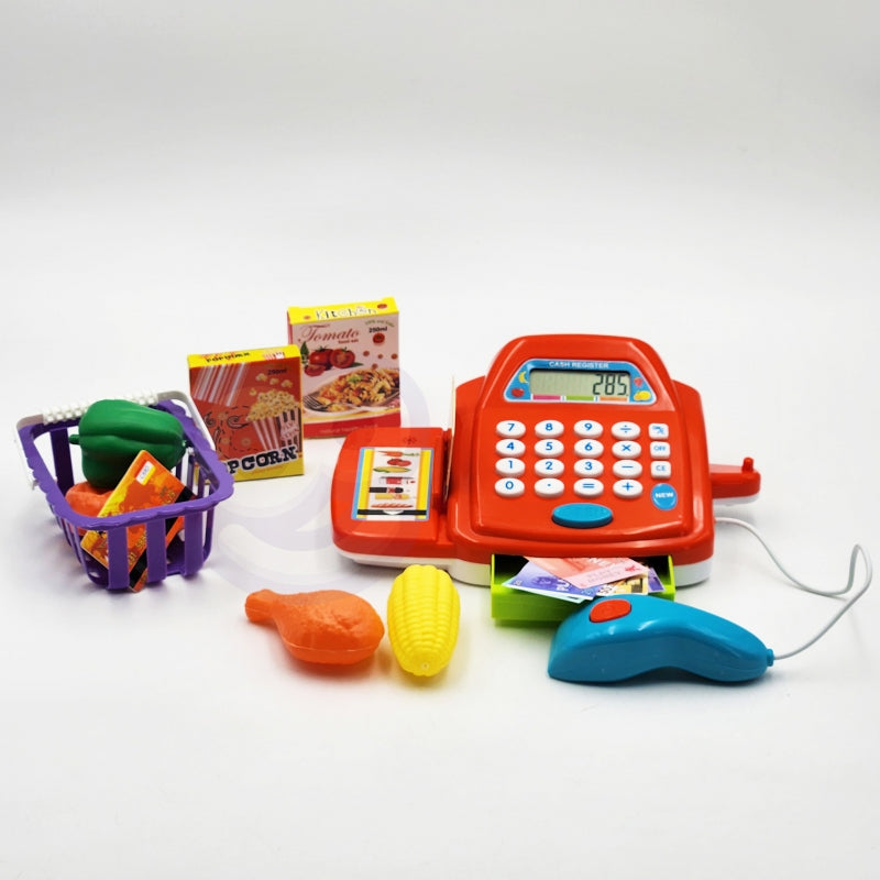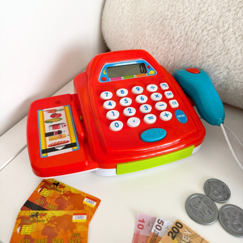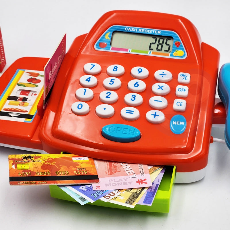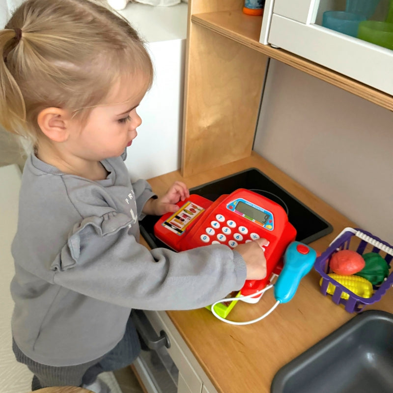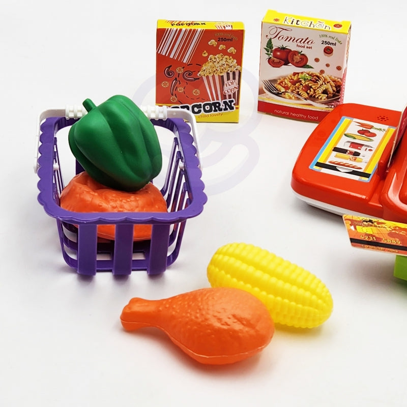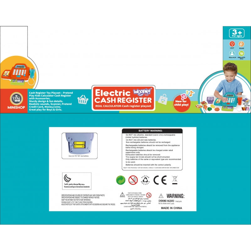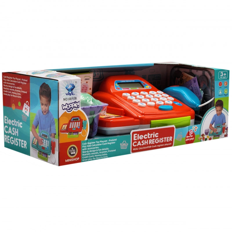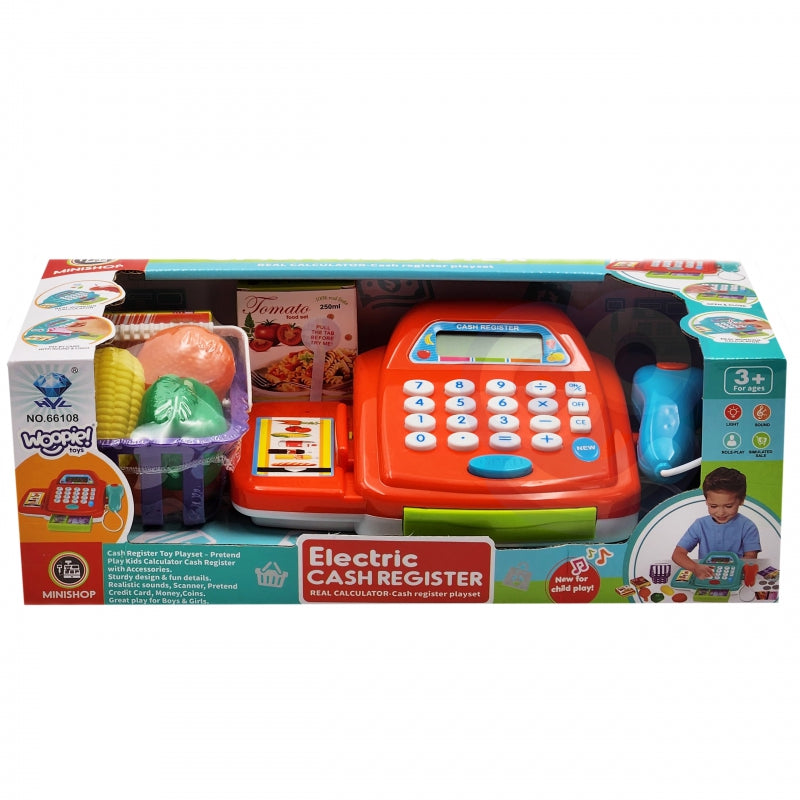 WOOPIE prekės ženklo parduotuvės kasos aparatas su pirkinių krepšeliu ir priedais idealiai tinka žaidimams. Vaikai gali išsirinkti norimus įsigyti produktus, sudėti juos į vežimėlį, o tada sukrauti į kasos aparatą. Naudodami skaitytuvą jie nuskaito pasirinktus produktus. Tada pirkėjas gali atsiskaityti pinigais arba mokėjimo kortele.