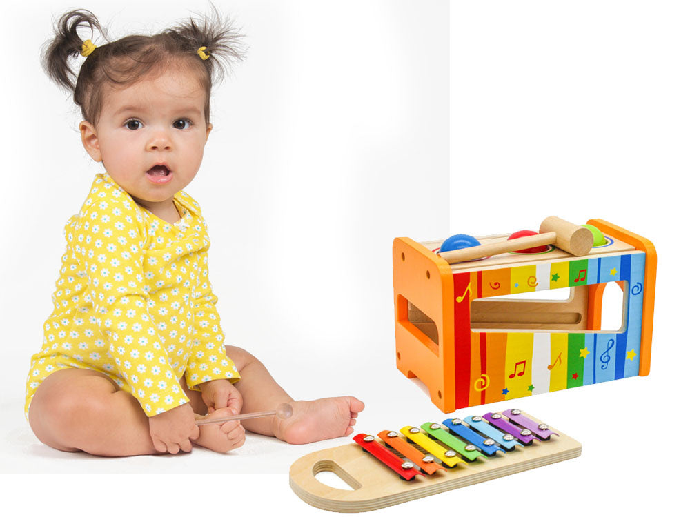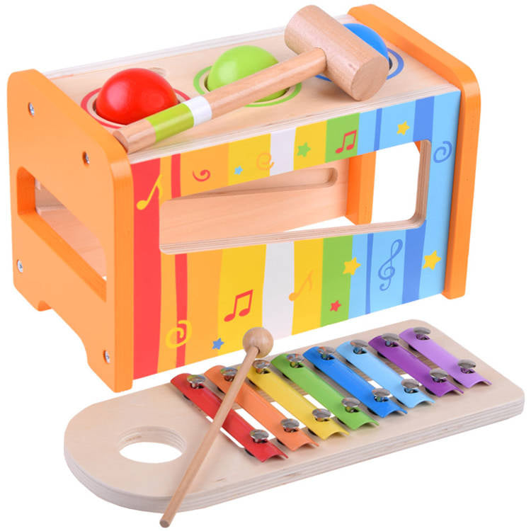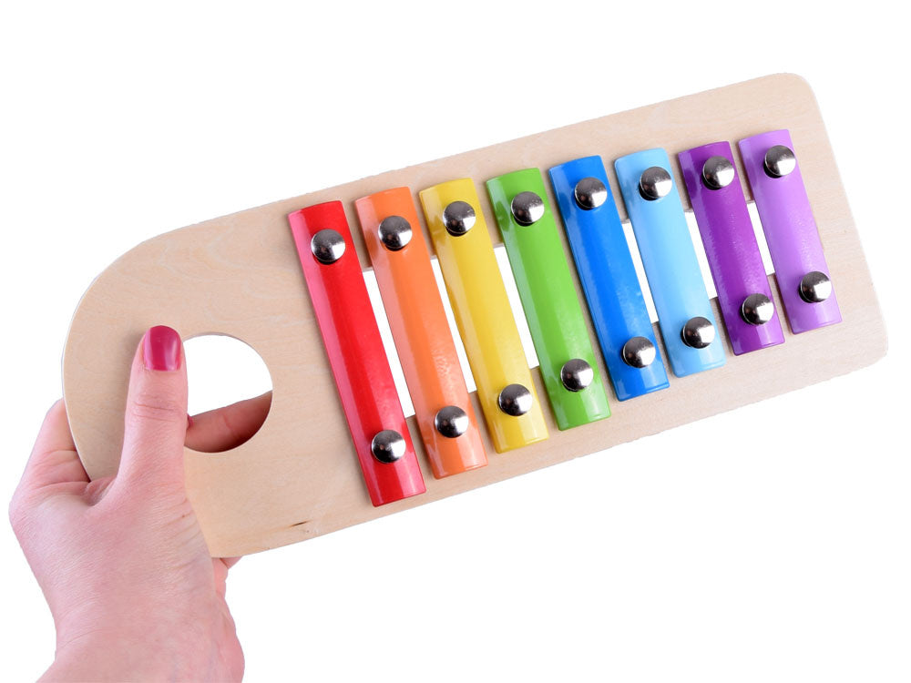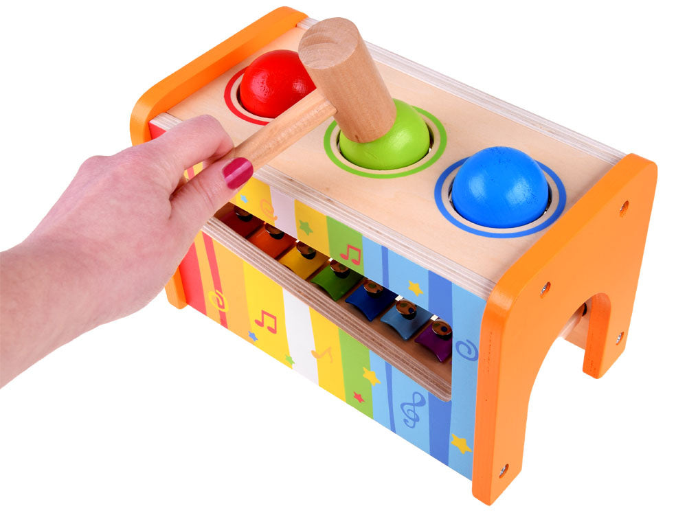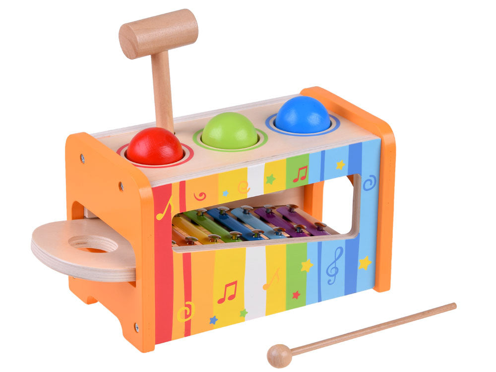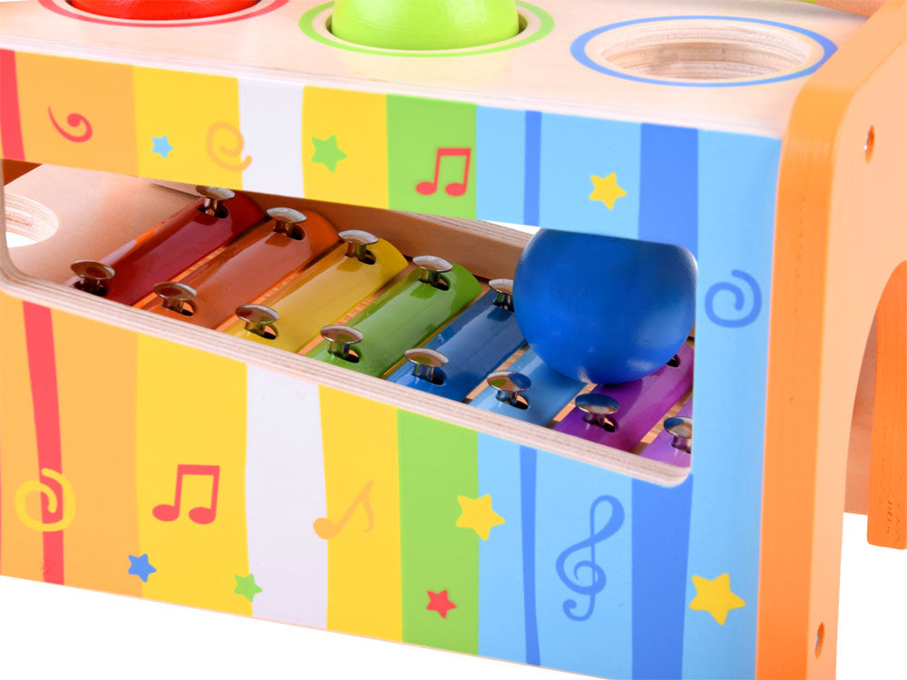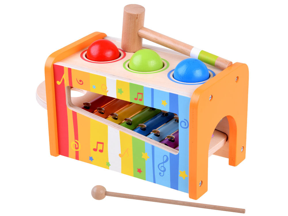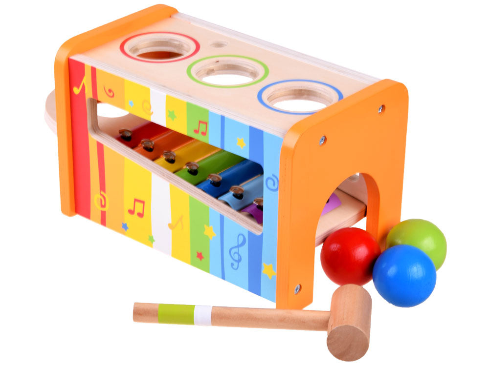 Medinis, spalvingas rinkinys metalofonas ir spalvingi kamuoliukai kiekvienam vaikui suteiks daug kūrybingų, muzikinių nuotykių žaidžiant. Mušant kamuoliukus - vaikas gali pro dėžutėje esančią skylutę išstumti kamuoliukus, kurie kris ant metalofono ir taip iš jų skleis garsą.