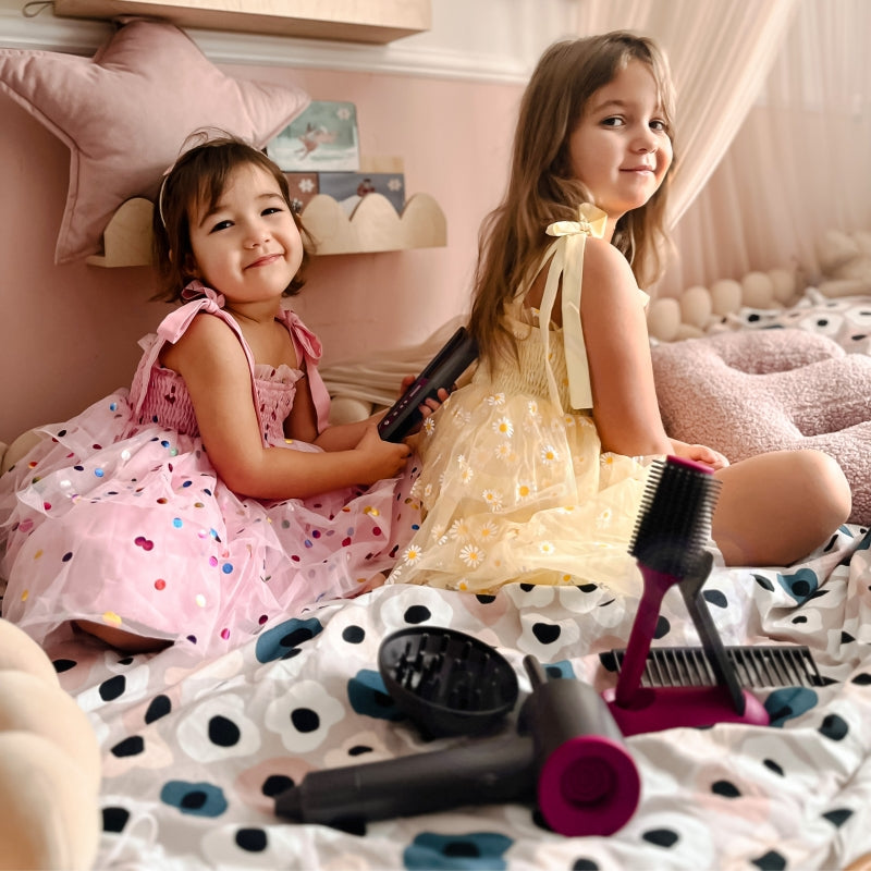 WOOPIE žaislinis plaukų džiovintuvas tiesintuvas skirtas vaikams, kurie mėgsta kūrybiškai žaisti ir nori mėgdžioti suaugusiuosius. Dėl saugių medžiagų vaikai gali žaisti kaip plaukų stilistai. Žaislas lavina rankų darbo įgūdžius, kūrybiškumą ir vaizduotę.