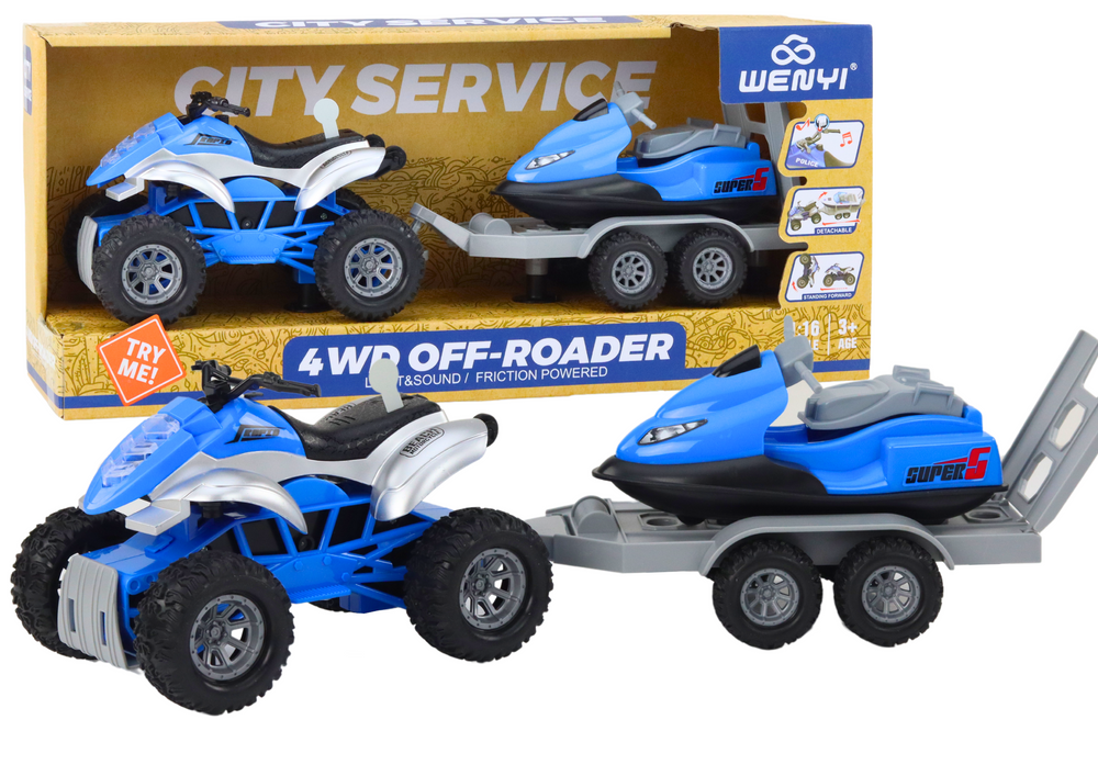 Žaislinis policijos keturratis su priekaba ir motorine valtimi, mėlynas