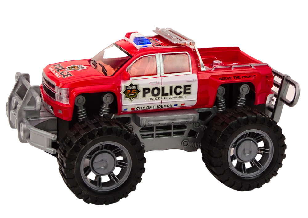 Visureigis policijos pikapas yra įspūdinga transporto priemonė, puikiai atkartojanti tikrą visureigį policijos automobilį. Jis yra didelis, todėl yra tvirtas ir įspūdingas. Transporto priemonė turi didelius juodus visureigio ratus, kurie užtikrina puikų sukibimą su įvairiais paviršiais ir leidžia žaisti sudėtingesnėmis sąlygomis. Dėl bendro dizaino ir detalių šis žaislas primena tikrą visureigį policijos automobilį, kuris tikrai pradžiugins mažuosius automobilių ir policijos entuziastus.