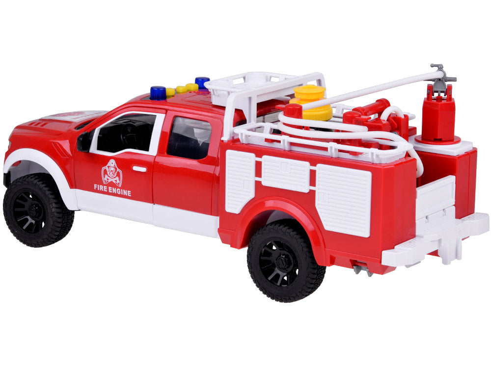 Žaislinis ugniagesių automobilis su vandens žarna, garso ir šviesos efektais