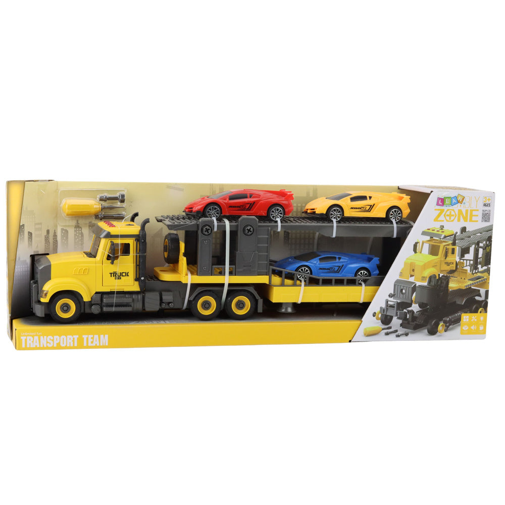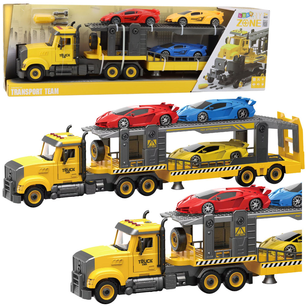 Žaislinis vilkikas su priekaba, atsuktuvu ir automobiliais