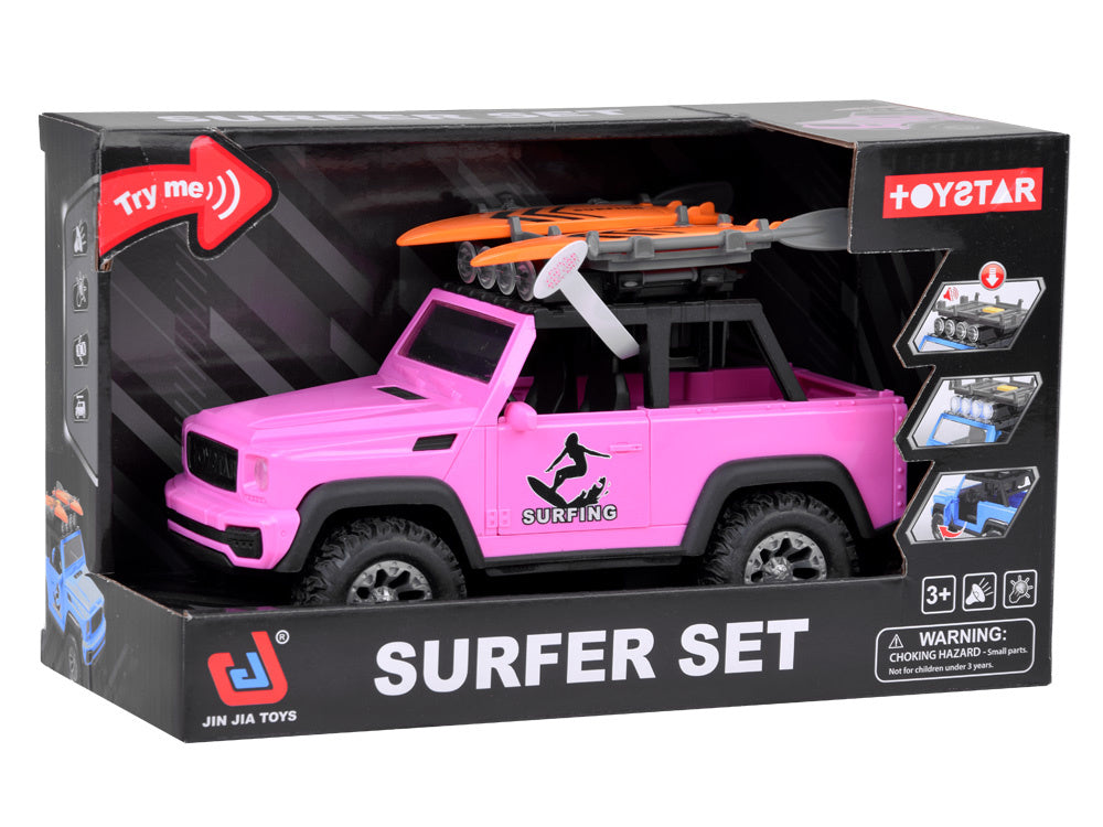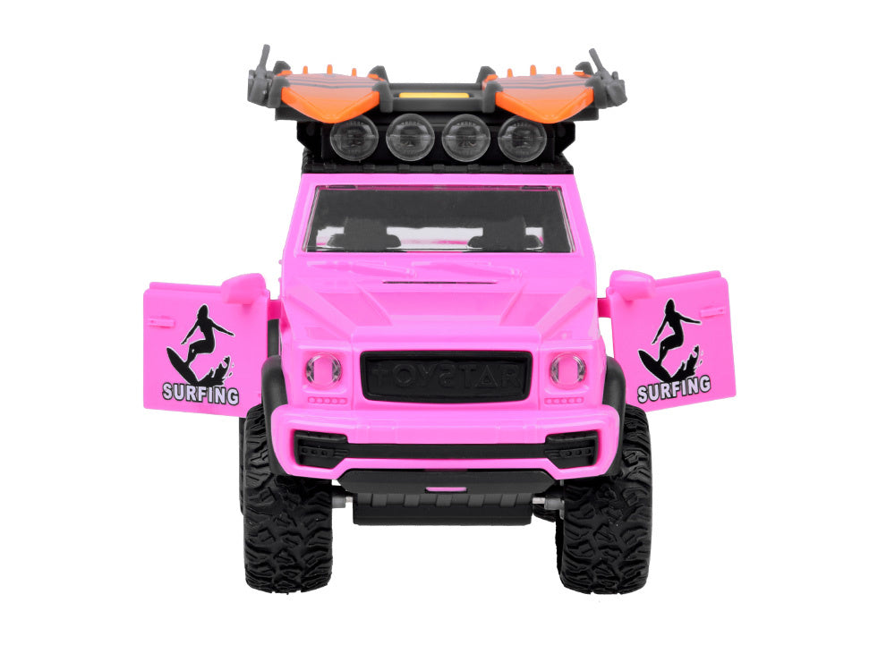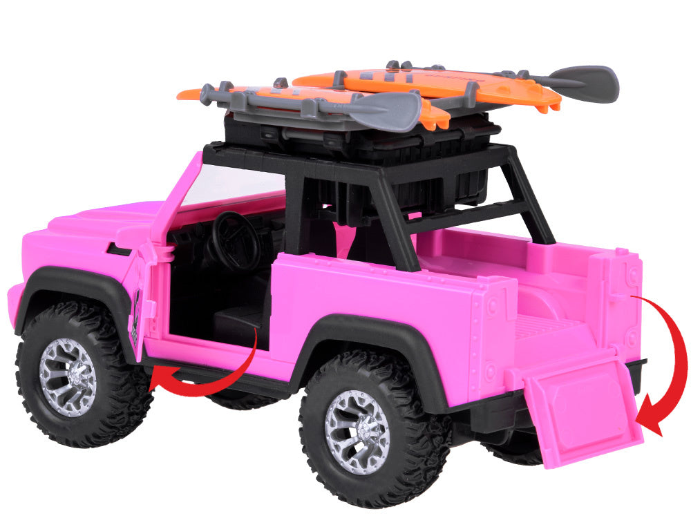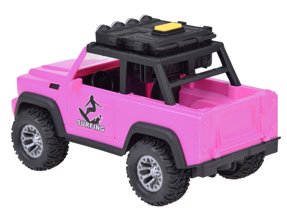 Rožinis automobilis su stogo bagažine - tai kiekvieno vaiko svajonės išsipildymas! Šis automobilis tikrai skirtas ypatingoms užduotims. Visureigis turi atsidarančias duris, nuleistą bagažinės dangtį, dideles, gumines, dygliuotas padangas, be to, yra fantastiškos, rožinės spalvos! Pasiruošę nuotykiams? Tad pirmyn!